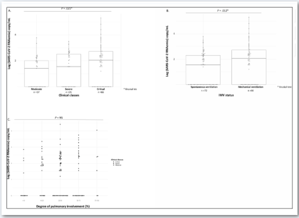 ▲圖1. A,139例臨床嚴(yán)重程度不同的COVID-19患者的SARS-CoV-2 RNAemia濃度。B,根據(jù)IMV狀態(tài)分析139例COVID-19患者的SARS-CoV-2 RNAemia濃度。C, SARS-CoV-2 RNAemia濃度(log copy/mL)與肺部嚴(yán)重程度的相關(guān)性。