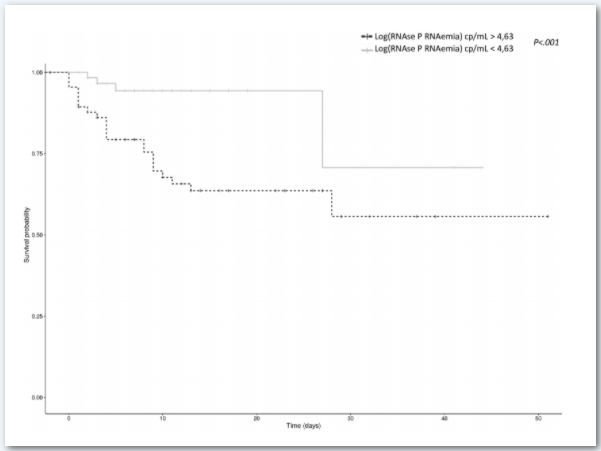 ▶ 入院時(shí)血漿RNase P RNA濃度與生存率有相關(guān)性。