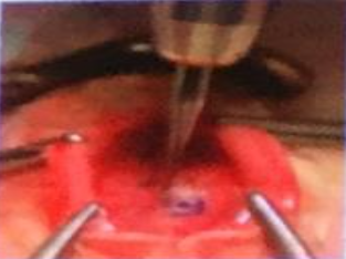 顱鉆垂直向下,不要抖動,顱骨開孔區(qū)域要濕潤:要鉆透顱骨,且不能出血。用小號鉆頭按標(biāo)記線開方窗。鉆頭在顱骨上來回打磨。逐漸深入:保持濕潤。