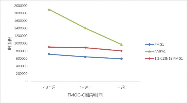 考察不同存儲時間的FMOC-Cl對目標物的影響,實驗結(jié)果如圖6所示。FMOC-Cl存儲時間對于草甘膦及其內(nèi)標影響較小,但對氨甲基膦酸有顯著影響,儲存時間越長峰面積越小。