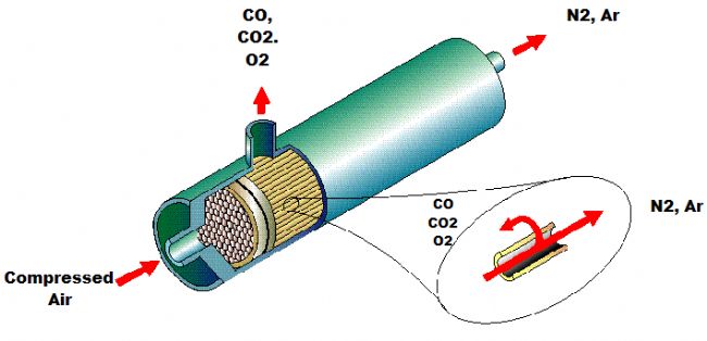將壓縮空氣通過(guò)中空的纖維膜管束,氧氣、二氧化碳等成分會(huì)通過(guò)纖維膜管道上的小孔,排到大氣中去,氮?dú)夂蜆O少量的氬氣會(huì)被收集起來(lái),經(jīng)過(guò)一系列的凈化后,輸送到應(yīng)用設(shè)備。這種氮?dú)夥蛛x提取技術(shù)簡(jiǎn)單有效,無(wú)需任何移動(dòng)部件。