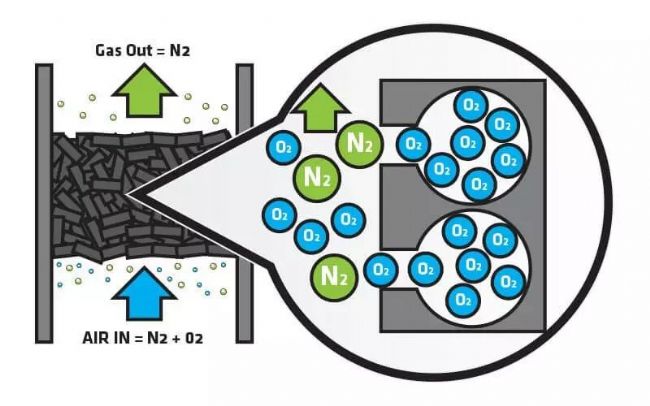 變壓吸附制氮的填充材料是碳分子篩,是一種多孔疏松的棒狀碳顆粒,當(dāng)壓縮空氣通過(guò)碳分子篩時(shí),根據(jù)氣體分子直徑的不同,碳分子篩會(huì)吸附氧氣,但是,氮?dú)獠粫?huì)被吸附,從而被分離。變壓吸附的過(guò)程包括吸附-解壓-重生階段。