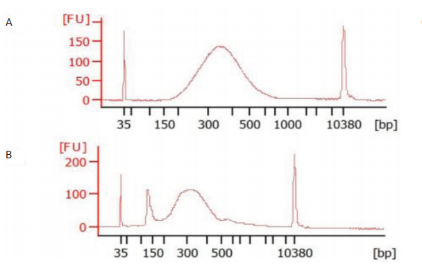 圖 7 使用安捷倫生物分析儀進(jìn)行NGS文庫QC。(A)高質(zhì)量文庫 (B)接頭二聚體約150bp的例子