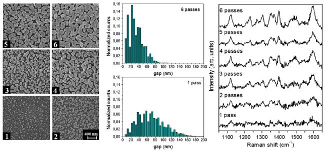 圖2中左圖為使用2.5×10-2M的AgNO3溶液作為WE墨水打印出的Ag納米粒子的FESEM圖像。在硅基板上打印次數(shù)分別為1到6次。中間圖給出打印1和6次的基底上納米粒子間隙的分布情況。右圖呈現(xiàn)基底測(cè)得花青素Cy5(1×10-6M)的SERS光譜圖。圖2測(cè)試結(jié)果顯示對(duì)于每次添加的墨水打印次數(shù),銀納米粒子的覆蓋范圍及大小都會(huì)增加。實(shí)際上,顆粒間間隙分布隨著打印頭通過次數(shù)的增加而變得越來越窄;同時(shí),粒徑增大。