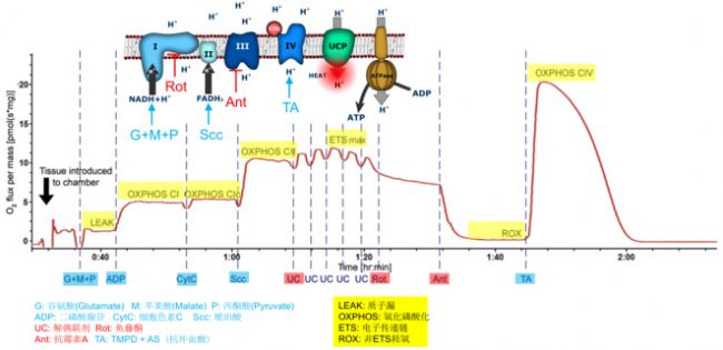 隨著不同試劑的加入,針對骨骼肌內(nèi)線粒體的各個復(fù)合物進行了耗氧率觀察,并同時檢測伴隨而來的活性氧的產(chǎn)出情況。