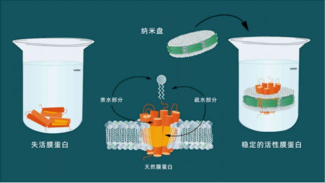 圖2:膜蛋白同時(shí)具有疏水性和親水性。納米盤可以使膜蛋白溶于水溶液。