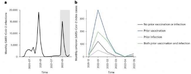 2023年1月2日,美國(guó)加州大學(xué)舊金山分校的研究人員在Nature Medicine上發(fā)表了題為“Infectiousness of SARS-CoV-2 breakthrough infections and reinfections during the Omicron wave”的文章,該文章通過(guò)分析35所加州州立監(jiān)獄在2021年12月至2022年5月之間的SARS-CoV-2感染監(jiān)測(cè)數(shù)據(jù),評(píng)估了Omicron在密接人群中的傳播風(fēng)險(xiǎn)。該研究結(jié)果表明,接種疫苗和/或既往感染能夠降低Omicron的傳播風(fēng)險(xiǎn),并且接種加強(qiáng)劑量的疫苗或者最近接種過(guò)疫苗均可進(jìn)一步降低傳播風(fēng)險(xiǎn),這些結(jié)果強(qiáng)調(diào)了接種疫苗在減少而非消除Omicron傳播方面的益處。