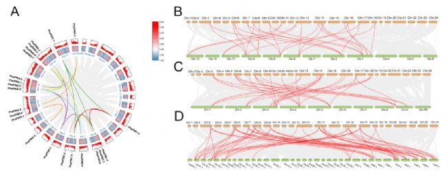 進(jìn)化過程中基因家族的擴(kuò)張和收縮會(huì)影響基因結(jié)構(gòu),進(jìn)而影響基因功能的分化,作者分析了毛竹PIN基因(PhePIN)家族的基因組同線群和比較共聯(lián)圖。研究發(fā)現(xiàn)分布在不同的染色體上的PIN基因的復(fù)制并導(dǎo)致毛竹中PIN家族基因的數(shù)量遠(yuǎn)高于水稻和擬南芥。全基因組水平上構(gòu)建的水稻、玉米和馬竹的比較共聯(lián)圖譜,發(fā)現(xiàn)毛竹的17個(gè)PhePIN基因與這3個(gè)物種的基因具有共線關(guān)系,表明這些基因在進(jìn)化早期就出現(xiàn)并穩(wěn)定存在。毛竹PIN基因在進(jìn)化上較為保守(圖3)。