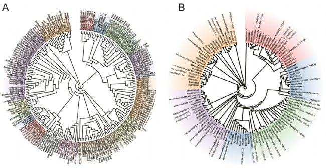 為了研究毛竹PIN基因家族的系統(tǒng)發(fā)育模式,作者選取了水稻、玉米、擬南芥等物種中的PIN基因、不同竹科的PIN基因分別與毛竹進(jìn)行系統(tǒng)發(fā)育樹的構(gòu)建。結(jié)果顯示PhePIN基因相對(duì)保守,在竹亞科內(nèi)親緣關(guān)系較近(圖4A)。另外,在竹科中,由于染色體倍性變化不大,其生物學(xué)功能可能更為集中和相似(圖4B)。
