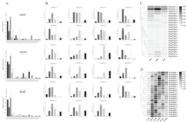 為了研究PIN基因家族的生物學(xué)功能,作者采用轉(zhuǎn)錄組學(xué)方法對(duì)不同毛竹組織(圖5A)、不同生長發(fā)育階段的竹筍(圖5B)、不同處理方式的竹筍(圖5C)中的PIN基因的表達(dá)模式分別進(jìn)行分析。結(jié)果發(fā)現(xiàn)PhePIN1亞家族和PhePIN9-5基因在所有數(shù)據(jù)中均特異性的高表達(dá),其他基因在不同發(fā)育階段、不同組織、不同處理中均有不同程度的特異性表達(dá)。