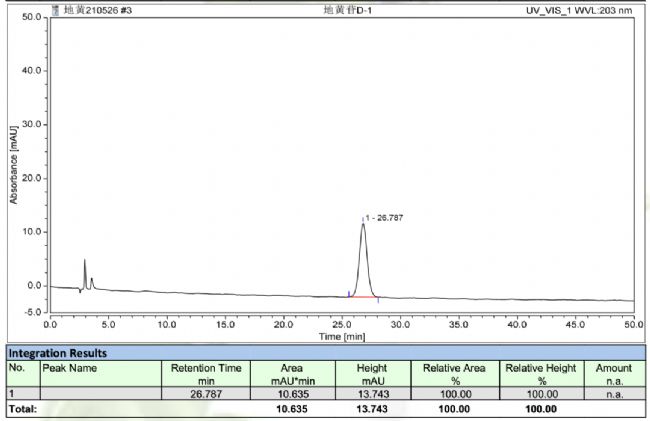 2、MicroPulite® Perfect T3 (4.6*250mm)5μm色譜柱通過優(yōu)化硅膠基質的孔徑和鍵合密度,從而使兩者能夠達到最佳平衡狀態(tài),檢測的化合物性質適應性極廣,能夠兼容100%水相,酸性條件耐受性好,極低柱流失。特別適用于流動相為高比例水相分析的藥材品種。例如:地黃(地黃色譜圖): 色譜柱:MicroPulite® Perfect T3 (4.6*250mm)5μm