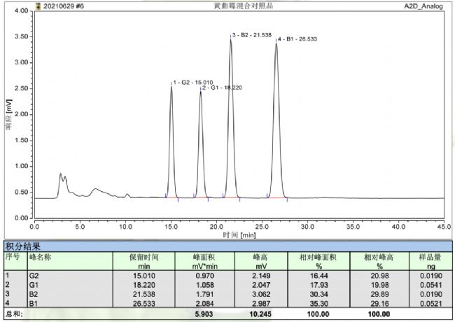 4、MicroPulite® DekAfla(4.6*250mm)5μm :2020中國藥典規(guī)定了黃曲霉毒素檢測和限量標準的藥材有:遠志,大棗,肉豆蔻,決明子,麥芽,陳皮,使君子,柏子仁,胖大海,蓮子,桃仁,檳榔,酸棗仁,薏苡仁,水蛭,地龍,全蝎,蜈蚣,僵蠶。微純生物科技有限公司提供了黃曲霉素專用柱。分析測得黃曲霉毒素 G2、黃曲霉毒素 G1、黃曲霉毒素 B2 和黃曲霉毒素 B1 15min-30min 內(nèi)完全均勻分布,且實現(xiàn)基線分離。四種黃曲霉素峰對稱性、峰形尖銳、分離度高。在黃曲霉素檢測中處于國際領先水平。色譜例圖: