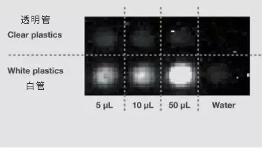 如下圖是三種不同透明度的管子,因為透明管四周均是透明的,對于底部試劑激發(fā)出來的熒光會散向四面八方,管內(nèi)的熒光信號只有少量能到達(dá)管頂部,最終只有少量信號進(jìn)入檢測器,且管間熒光信號不一致。