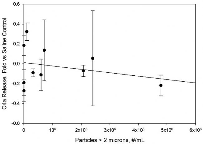 圖5。10微米以上顆粒濃度對(duì)人血清樣品中C5a(填充圓)和C3a(開放圓)濃度的影響據(jù)報(bào)道,在生理鹽水對(duì)照樣品中,濃度隨C5a和C3a水平的增加而增加。顆粒濃度是指IVIg制劑在稀釋10倍于人血清之前的濃度。直線表示最小二乘線性擬合,C5a和C3a相關(guān)系數(shù)分別為r2=0.60和r2= 0.47。