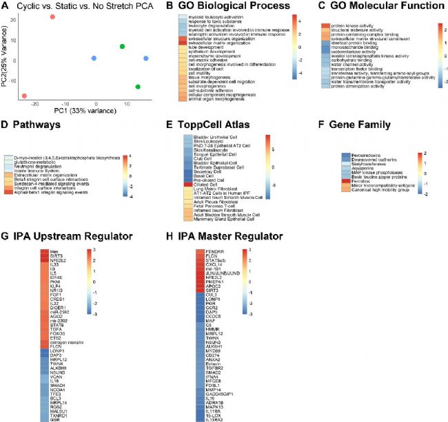 實(shí)驗(yàn)對(duì)類器官進(jìn)行了20小時(shí)的循環(huán)拉伸,并從這些mLOs 中提取RNA,mLO 承受相同大小的靜態(tài)拉伸以及不施加拉伸。PCA揭示了靜態(tài)和無拉伸mLOs之間的相似性,以及這兩組和循環(huán)拉伸mLOs具有良好的分離性(圖2 A)。由于靜態(tài)和無拉伸mLOs相似,將它們與對(duì)照循環(huán)拉伸mLOs進(jìn)行比較,以確定循環(huán)拉伸是否激活了與細(xì)胞外基質(zhì)結(jié)構(gòu)和組織、細(xì)胞-基質(zhì)粘附和間質(zhì)發(fā)育相關(guān)的GO生物過程。結(jié)果表明,與先天免疫相關(guān)的過程下調(diào)(圖2 B)。GO分子功能項(xiàng)的統(tǒng)計(jì)學(xué)強(qiáng)度相對(duì)較弱,其中“蛋白激酶活性”增加,“單糖結(jié)合”和“氧化還原酶活性”降低最為顯著(圖2 C)。ToppGene通路分析發(fā)現(xiàn),通過整合素進(jìn)行的細(xì)胞-基質(zhì)相互作用在循環(huán)拉伸中最為顯著地上調(diào)(圖2 D)。與靜態(tài)拉伸和無拉伸相比,循環(huán)拉伸降低了大量與肺上皮細(xì)胞相關(guān)的基因豐度,并增加了與平滑肌細(xì)胞和成纖維細(xì)胞相關(guān)的基因數(shù)量(圖2 E)。與GO分子功能類似,基因家族分析受到統(tǒng)計(jì)功效的限制,fermitins 上調(diào),peroxiredoxins 降低。Fermitins調(diào)節(jié)整合素-基質(zhì)相互作用。IPA上游調(diào)控(圖2 G)和主調(diào)控(圖2 H)分析結(jié)果表明:1)循環(huán)拉伸通過SIRT3改變組蛋白乙;;2)STAT信號(hào),MAP激酶激活和轉(zhuǎn)化生長(zhǎng)因子α上調(diào);3)TGF-β和MyD88信號(hào)降低,microRNAs和長(zhǎng)非編碼RNAs的變化可能介導(dǎo)許多觀察到的基因表達(dá)變化。這些數(shù)據(jù)表明,循環(huán)拉伸促進(jìn)從上皮細(xì)胞功能向細(xì)胞外基質(zhì)和間質(zhì)細(xì)胞的成熟和組織的轉(zhuǎn)變。