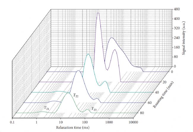 陜西理工大學的金文剛團隊在大鯢的食品加工方面進行了新型的探索,實驗探討焙燒工藝對大鯢肉干在焙燒過程中品質(zhì)特性及水分流動性的影響,在實驗過程中,使用低場核磁共振(FSMag)進行T2橫向弛豫試驗,得到了T2弛豫反演譜圖。