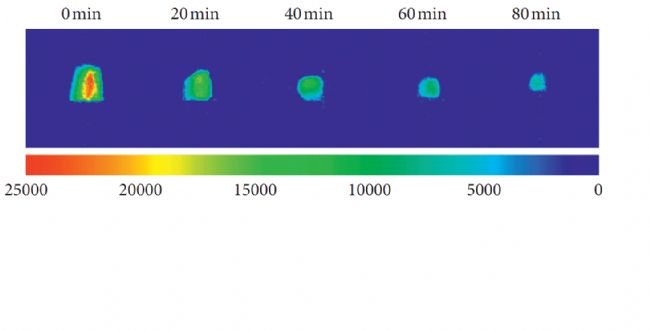通過不同烘烤時間的大鯢肉干質(zhì)子密度加權磁共振圖像及對應的定量信號強度直方圖可以明顯看出隨著焙燒時間的延長,較亮比例的質(zhì)子信號呈穩(wěn)定衰減,表明焙燒后水分較長的T2信號下降。此外,質(zhì)子信號從外表面向內(nèi)區(qū)域的收縮也能被清楚地發(fā)現(xiàn)。同時,水比26.44%的大鯢肉干焙燒80 min后紅區(qū)基本消失,說明質(zhì)子積累較少。