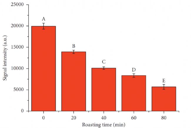 結果表明,在40 ~ 60 min的烘烤時間內(nèi),大鯢肉干的整體可接受性得分較高。此時肉干含有大量的健康不飽和脂肪酸,適合作為營養(yǎng)型大鯢肉干生產(chǎn)時間的參考,同時LF-NMR和MRI可以作為一種快速、無損的分析工具來描述焙燒過程中的品質(zhì)特征。