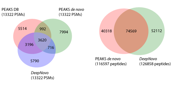 圖1 維恩圖左邊是PEAKS DB,PEAKS de novo 和DeepNovo的多肽的比較,右圖為PEAKS de novo 和DeepNovo氨基酸的比較。