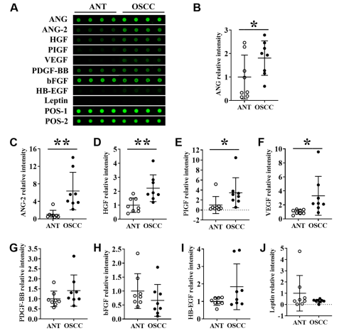 圖1.通過蛋白陣列分析OSCC和ANT中血管生成標(biāo)志物的蛋白水平 (A)含有代表性蛋白因子的熒光結(jié)果圖(B-J)蛋白陣列圖像中對(B)血管生成素、(C) ANG-2、(D)肝細(xì)胞生長因子 HGF、(E) PIGF、(F) 血管內(nèi)皮生長因子VEGF、(G)血小板源性生長因子 PDGF-BB、(H) 胎盤生長因子bFGF、(I) 肝素結(jié)合性表皮生長因子HB-EGF和(J)瘦素leptin表達(dá)的定量分析。數(shù)據(jù)以平均±標(biāo)準(zhǔn)差,n=8表示。與ANT組相比,有顯著性差異,*p<0.05,**p<0.01。