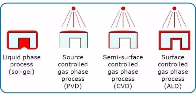 通過(guò)溶膠-凝膠、PVD、CVD 和 ALD 方法在復(fù)雜表面上沉積薄膜的示意圖