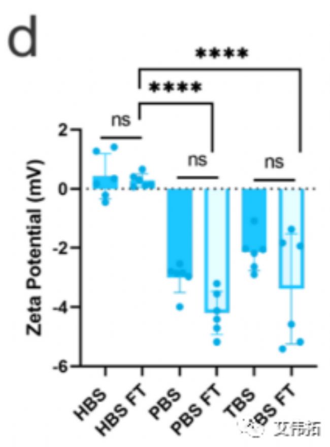 HEPES和Tris中LNPs的PDI在凍融前后基本保持一致,而PBS中LNPs在解凍后PDI增加了3倍(上圖b)。FT后Zeta電位也略有下降(上圖d)。