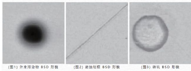 圖1所示外來(lái)污染物尺寸大小不一,所含元素不固定,有些含有鈉、氯等元素。圖 2 所示劃痕屬典型的二維缺陷,極細(xì)小,能譜分析結(jié)果常為鐵或者鐵和氧。圖 3 所示微坑尺寸較小,能譜分析結(jié)果常為鐵或者鐵和氧,少數(shù)含有微量的錳元素,一般存在于鑄坯類(lèi)試樣中,可能源于鑄坯內(nèi)部本來(lái)存在的孔洞,也可能是在后期處理時(shí)快速氧化,氧化物脫落留下的疤痕。