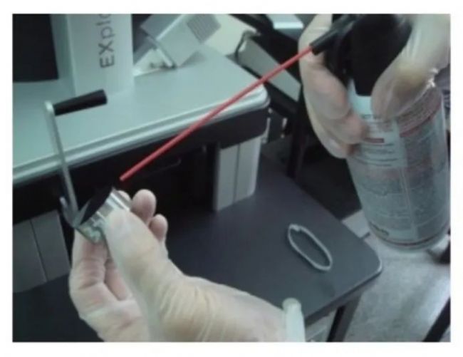 2)壓縮空氣第一次吹拭:試樣干燥后,用壓縮空氣吹拭,主要是將檢測(cè)面四周黏附的絲絨等污物吹掉,也避免在下一步異丙醇擦拭時(shí)將邊部的污物帶到檢測(cè)面上,如下圖所示。前期一直采用洗耳球吹拭,由于洗耳球力度不夠大,吹拭后還會(huì)有一些細(xì)小的污物附著在檢測(cè)面上,如絲絨纖維等干燥后會(huì)黏附在試樣上,且附著力較強(qiáng)。