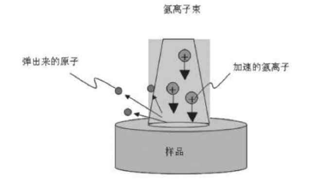 離子研磨實現(xiàn)的過程中,首先通過一個高壓電極來對氬氣進行電離,從而形成氬離子;繼而再通過一個高壓電場來對氬離子實施加速,經(jīng)過帶有偏轉(zhuǎn)電場的離子槍頭,使其形成離子束對需要研磨的樣品進行轟擊,將樣品表面物質(zhì)以原子的形態(tài)清除出去,以使得樣品達到無應(yīng)力研磨的效果。如圖 1 所示。在整個過程中會調(diào)整一些參數(shù),例如離子能量,離子束入射角,以優(yōu)化樣品制備時間和表面質(zhì)量。