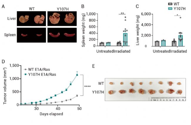 此外,用腺病毒 E1A 和突變 Ras 轉(zhuǎn)化 WT 和 Y107H MEF,將 E1A/Ras MEF 皮下注射到免疫受損小鼠中,并測量腫瘤隨時間的生長情況。Y107H E1A/Ras 腫瘤的生長速度明顯快于 WT 腫瘤 (圖 3D-E)。
