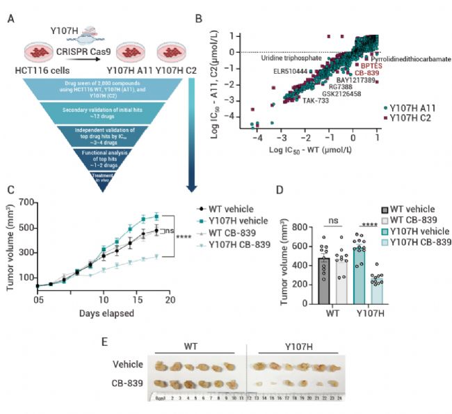 (A) 帶有 Y107H 突變的 HCT116 結(jié)直腸癌細胞(克隆 A11 和 C2)的 CRISPR 生成以及隨后篩選誘導 Y107H 克隆活力喪失增強的化合物的示意圖。(B) 使用 WT p53 或 Y107H 克隆 A11 和 C2 檢測化合物針對 HCT116 細胞的 IC50 值。指出了在兩個 Y107H 克隆中顯示出顯著增加的敏感性的化合物。(C) 在媒介物或 CB-839 處理后,NSG 小鼠中帶有 WT p53 或 Y107H 克隆 A11 的 HCT116 細胞的腫瘤生長。腫瘤達到 50 mm 3后,通過口服管飼法每天 2 次施用媒介物或 CB-839。線性混合模型估計了 CB-839 治療降低腫瘤生長率(mm3/天)的差異。(D) 最終腫瘤體積,顯示為用載體或 CB-839 處理的 HCT116 腫瘤的平均體積。(E) 用載體或 CB-839 治療的 HCT116 腫瘤的代表性圖像。