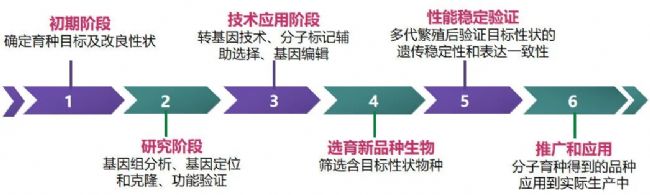 分子育種主要包含確定改良性狀、對目的性狀相關(guān)基因研究、目的基因的識別和基因編輯、篩選目標(biāo)性狀物種、篩選穩(wěn)定遺傳性狀的后代、新品種的應(yīng)用及推廣等階段。