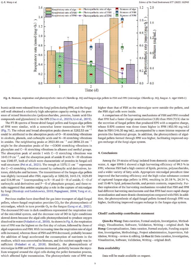 為了實(shí)現(xiàn)高效和低成本的微藻收獲,對(duì)收獲效率進(jìn)行了調(diào)查以及真菌利用真菌孢子輔助收獲兩種策略對(duì)小球藻HQ的潛在機(jī)制(FSH)和真菌顆粒輔助收獲(FPH)。從生活污水中分離出的19種真菌中有5種可以形成顆粒,黑曲霉HW8-1的收獲效率最高,為99.17%FPH和FSH分別為88.70%。FSH的脂質(zhì)和多糖含量是真菌藻類顆粒的2-3倍與FPH相比,引起更豐富的飽和和單不飽和脂肪酸。此外,通過(guò)優(yōu)化微藻預(yù)培養(yǎng)時(shí)間、葡萄糖濃度和微藻初始密度、高價(jià)值物質(zhì)的含量,F(xiàn)PH后菌藻顆粒的脂質(zhì)、多糖和蛋白質(zhì)含量從5.96%提高到5.96%,分別為20.18%、24.34%和10.48%。此外,真菌顆粒分泌更多的細(xì)胞外與FSH相比,F(xiàn)PH過(guò)程中的聚合物質(zhì)(EPS)可以通過(guò)降低真菌顆粒的表面電位。FPH導(dǎo)致藻類細(xì)胞覆蓋在外部,從而增加了光暴露面積藻類,從而提高光合作用速率,而FSH主要通過(guò)菌絲纏繞。