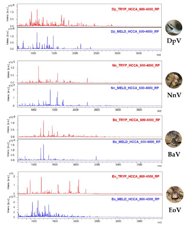 首先作者各選取了眼鏡蛇科和蝮蛇科的2種蛇,提取毒液后分別使用傳統(tǒng)胰酶單一酶切(TRYP)和多酶限時酶切(MELD)兩種方法進行處理,酶切產(chǎn)物采集了MALDI TOF PMF圖譜,發(fā)現(xiàn)總體上不同酶切方法對離子采集數(shù)量影響不是很大,但MELD的酶切產(chǎn)物的響應(yīng)強度有所提高(圖2)。