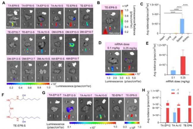 TE-EP8-S具有兩個疏水尾部和五個仲胺基,所得的CLNs在脾臟中獲得了最高的mRNA表達(圖3B)。其介導的熒光素酶表達在脾臟中高出幾個數(shù)量級,并呈劑量依賴性增加。