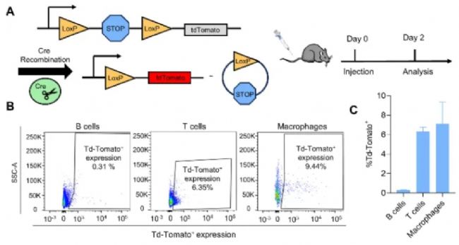 引入loxp-Cre重組系統(tǒng)的Ai9小鼠模型可以在Cre重組蛋白存在的情況下誘導tdTomato的表達來刪除轉(zhuǎn)錄終止信號盒(stop cassettes)。實驗表明,裝載Cre mRNA的TE-EP8-S CLNs有效地促進了脾臟中的蛋白表達,在靜脈注射給藥后,近6%的T細胞被轉(zhuǎn)染(圖4B,C)。