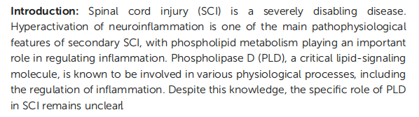 脊髓損傷(SCI)是一種嚴(yán)重的致殘性疾病,神經(jīng)炎癥的過度活化是繼發(fā)性脊髓損傷的主要病理特征之一,其中磷脂代謝在炎癥調(diào)節(jié)中起關(guān)鍵作用。磷脂酶D (Phospholipase D, PLD)是一種重要的脂質(zhì)信號(hào)分子,參與多種生理過程,包括炎癥調(diào)節(jié),但是PLD在SCI中的具體作用機(jī)制仍不清楚。
