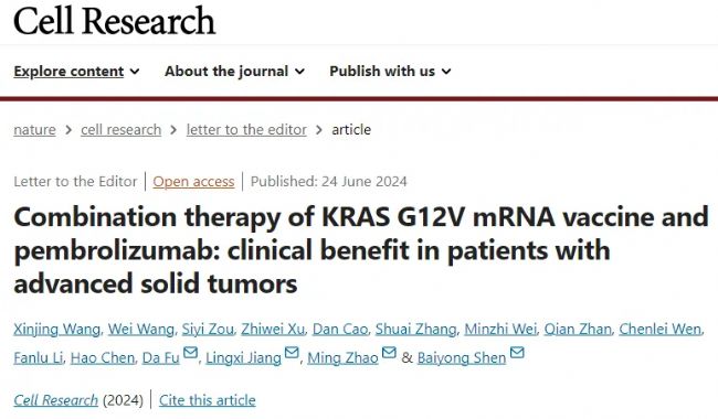2024年6月24日,上海交通大學(xué)醫(yī)學(xué)院附屬瑞金醫(yī)院胰腺疾病診療中心沈柏用教授、上海信譜生物醫(yī)藥科技有限公司趙明、瑞金醫(yī)院胰腺疾病研究所蔣玲曦研究員、符達(dá)研究員等以共同通訊作者身份在國(guó)際醫(yī)學(xué)頂刊Cell Research(IF 28.1,Q1)在線發(fā)表了mRNA腫瘤疫苗研究新進(jìn)展: Combination therapy of KRAS G12V mRNA vaccine and pembrolizumab: clinical benefit in patients with advanced solid tumors,該研究報(bào)道了針對(duì)KRAS G12V單靶點(diǎn)的mRNA腫瘤疫苗在實(shí)體瘤中的治療效果。
