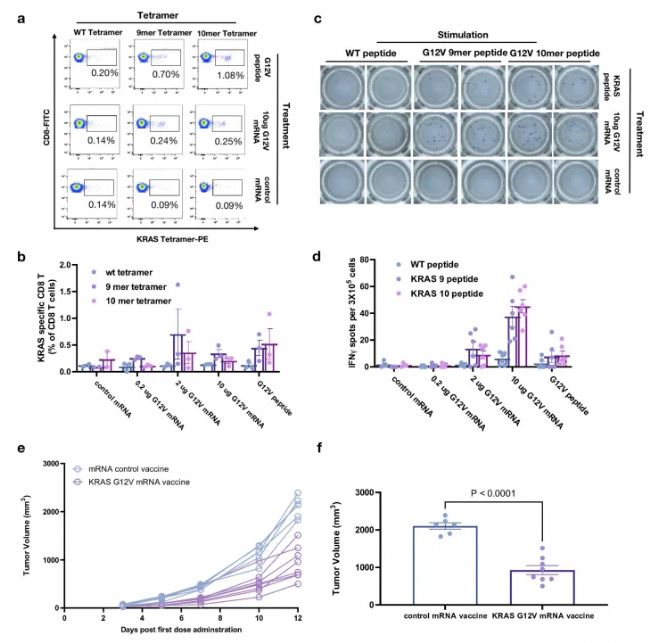 KRAS與高致命性癌癥有關(guān),如胰腺導(dǎo)管腺癌(PDAC)和非小細(xì)胞肺癌(NSCLC)。已知在多個(gè)肽-MHC組合中,KRAS G12V-HLA-A*11:01有最強(qiáng)的親和力,誘導(dǎo)T細(xì)胞反應(yīng)的成功率最高,對(duì)腫瘤細(xì)胞的殺傷作用最明顯。研究者使用質(zhì)譜法驗(yàn)證了KRAS G12V新抗原的表達(dá)和呈遞及其與HLA-A*11:01的結(jié)合(圖S1)。通過四聚體染色實(shí)驗(yàn)、ELISPOT實(shí)驗(yàn),以及用KRAS G12V mRNA疫苗處理HLA-A*11:01小鼠,證明了KRAS G12V mRNA疫苗可以誘導(dǎo)G12V特異性T細(xì)胞在體內(nèi)的擴(kuò)增(圖S2 a,b)和激活(圖S2 c,d),隨后減緩了攜帶有KRAS G12V腫瘤的生長(zhǎng)(圖S2 e,f)。這些臨床前研究結(jié)果證實(shí)了KRAS G12V mRNA疫苗可以誘導(dǎo)抗原特異性的細(xì)胞毒性T淋巴細(xì)胞(CTL)。