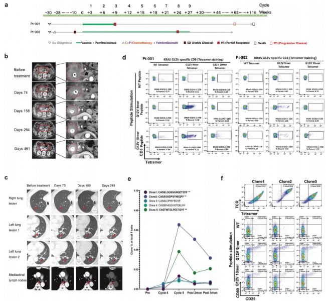 圖1 晚期實(shí)體瘤中靶向KRAS G12 V突變(HLA-A*11:01限制性)mRNA疫苗的臨床獲益及特異性T細(xì)胞檢測(cè)。