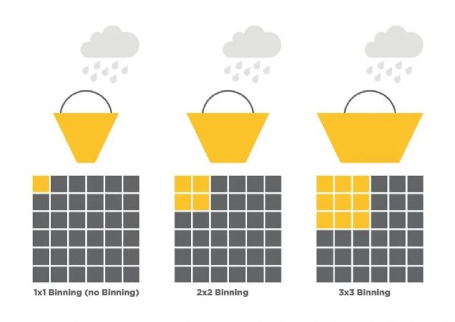 較小的像素可以合并,這意味著傳感器上相鄰像素的信號可以合并以創(chuàng)建單個更大的有效像素(稱為超像素),從而提高靈敏度,從而縮短曝光時間。像素合并的缺點是它確實會導(dǎo)致分辨率損失。3 桶圖形通過桶中捕獲雨水來解釋這一點。較大的水桶可以捕獲更大的雨滴量; 因此,更大的像素可以捕獲更多的光子。