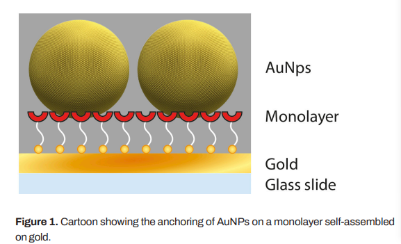 將金納米顆粒固定在自組裝的單層金上。單分子層鏈端上的官能團(tuán)促進(jìn)了金納米顆粒在層上的錨定。多參數(shù)表面等離子體共振(MP-SPR)可以實(shí)時測量金納米顆粒與表層的結(jié)合情況。