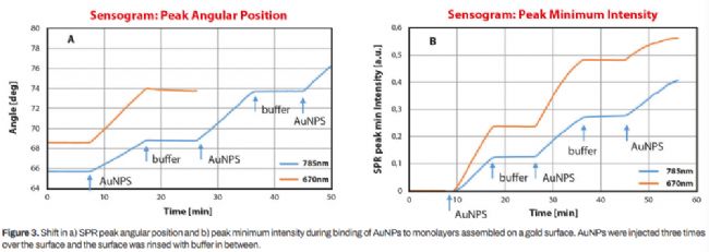 在金表面組裝具有官能團(tuán)的單層膜可用于金納米粒子的偶聯(lián)。在這項(xiàng)研究中,MP-SPR被證明是實(shí)時測定金屬納米顆粒沉積到表面層的獨(dú)特方法。AuNPs表現(xiàn)出強(qiáng)烈的表面等離子體共振,當(dāng)納米顆粒與表面層相互作用時,MP-SPR甚至可以觀察到很大的響應(yīng)。鏈末端的官能團(tuán)可以錨定金納米顆粒,甚至嵌入到鏈中。MP-SPR是一種獨(dú)特的工具,用于研究金屬納米顆粒在傳感器、電子、光子學(xué)、太陽能電池或癌癥診斷和治療中的應(yīng)用。