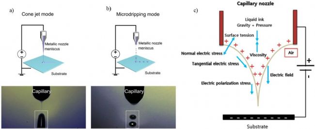 EHD噴墨打印技術(shù)是通過(guò)在噴嘴尖端和基材之間使用電場(chǎng)力,使墨水產(chǎn)生泰勒錐來(lái)實(shí)現(xiàn)的,當(dāng)泰勒錐內(nèi)的庫(kù)侖力超過(guò)功能性油墨的表面張力時(shí),通過(guò)EHD在基材上打印高分辨率的連續(xù)噴射線(xiàn)或液滴如圖1所示1a和b,使所得圖案的分辨率高于1μm,這種方法能夠生產(chǎn)出復(fù)雜的納米/微米尺寸設(shè)計(jì),詳細(xì)原理可見(jiàn)睿度往期文章《Technology | 關(guān)于電流體動(dòng)力學(xué)(EHD)噴墨打印的介紹》。
