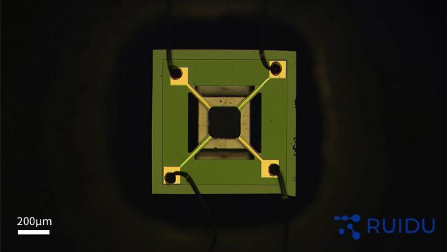 ▲ 圖a RUIDU EHD電流體動(dòng)力噴墨打印系統(tǒng)制備的氣體傳感器敏感材料膜層,沉積區(qū)域:200×200μm
