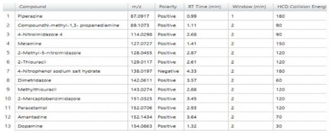儀器方法使用數(shù)據(jù)依賴掃描模式進行采集,以獲得高質量的二級譜圖,同時在Targeted Mass列表里,包含了保留時間及碰撞能量,確保不同化合物都具有很好的響應及二級碎片。