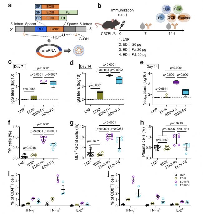 研究人員設(shè)計了編碼ZIKV包膜蛋白域III與人IgG1 Fc片段融合蛋白(EDIII-Fc)和非結(jié)構(gòu)蛋白1(NS1)的circRNA。結(jié)果顯示,EDIII-Fc circRNA比EDIII-Fd(三聚體形式)和單體EDIII circRNA表現(xiàn)出更好的免疫原性,誘導(dǎo)了更強的生發(fā)中心反應(yīng)和更高水平的中和抗體(圖1)。這一發(fā)現(xiàn)強調(diào)了抗原結(jié)構(gòu)在疫苗設(shè)計中的重要性。