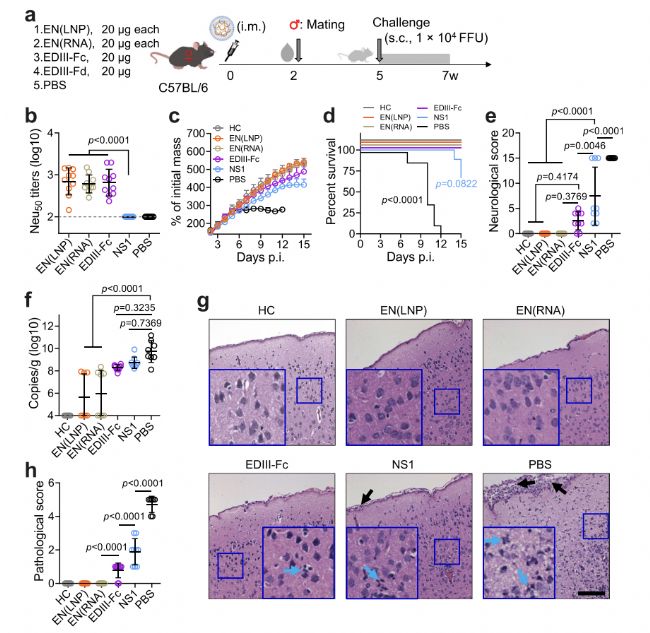 為提高疫苗保護作用,研究合成NS1 circRNA,并將等量EDIII-Fc和NS1的circRNA組合成兩種不同的配方:EN(LNP)是LNP分別包封兩種circRNA;EN(RNA)是LNP包封EDIII-Fc和NS1 circRNA的預(yù)混合物。將circRNA疫苗分別肌肉注射到C57BL/6小鼠體內(nèi),結(jié)果發(fā)現(xiàn)兩種配方的EDIII-Fc和NS1 circRNA的組合疫苗,與單獨circRNA相比,都可更好地保護新生兒免受寨卡病毒引起的癥狀和腦損傷。