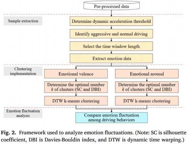 因此,本研究引入一個新的框架來分析不同駕駛行為的情緒波動差異。首先考慮情緒的不穩(wěn)定性,分析了情緒波動對駕駛行為的影響;其次,對情緒的描述關(guān)注兩個維度,即效價和喚醒度。通過分析駕駛員在真實駕駛過程中的面部表情視頻,得出這兩個指標數(shù)據(jù),構(gòu)成實時、真實的數(shù)據(jù)集。最后,基于聚類方法得到的不同駕駛行為的情緒變化模式。這些模式可以用于在線監(jiān)測司機的情緒變化,從而提供給司機必要和及時的警告,減輕與情緒相關(guān)風險行為。