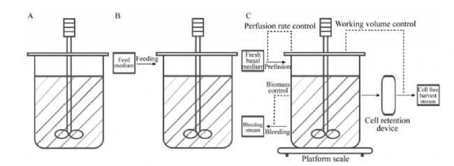 相比于為期14天的傳統(tǒng)流家培養(yǎng),反應(yīng)器灌流培養(yǎng)除了pH、DO、溫度、攪拌等控制模塊外,還包 含了連續(xù)的培養(yǎng)基流入(media)模塊、通過細胞截留設(shè)備 實現(xiàn)的細胞液收獲模塊(harvest),以及控制罐內(nèi)恒定細胞密度的細胞液流出 (bleeding)模塊 。灌流培養(yǎng)通過不斷移出副產(chǎn)物,同時補充營養(yǎng)物質(zhì),因此可提供對細胞穩(wěn)定且有利的生長環(huán)境。與批次培養(yǎng)和補料批次培養(yǎng)相比,灌流培養(yǎng)可以在高細胞密度環(huán)境下長時間維持穩(wěn)定培養(yǎng)環(huán)境,同時降低產(chǎn)物 在培養(yǎng)基里的停留時間,這有利于提高產(chǎn)品質(zhì)量。研究發(fā)現(xiàn) ,灌流培養(yǎng)可實現(xiàn)培養(yǎng)基組 分中的動態(tài)變化對蛋白質(zhì)糖基化的影響最小,這一研究結(jié)果表明灌流培養(yǎng)有利于提高產(chǎn)品質(zhì)量。